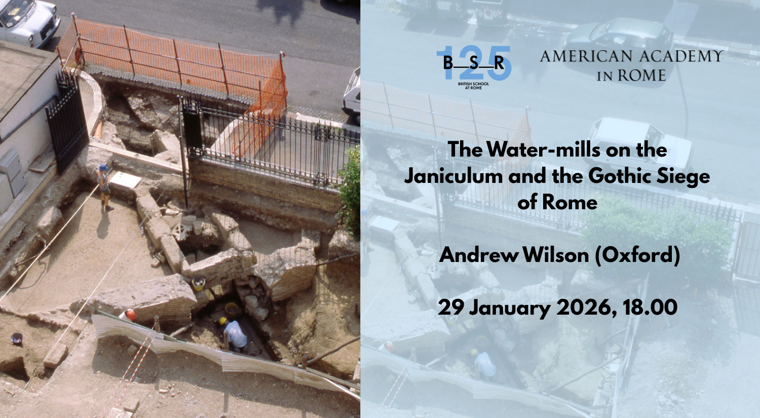 On January 29, 2026 the American Academy in Rome will present the third lecture on Material Environments, on campus and streamed on Zoom. Roman economy expert Andrew Wilson will speak on "The Water-mills on the Janiculum and the Gothic Siege of Rome." As they note, "this talk draws together the results of several excavation campaigns conducted in and around the Academy parking lot, exploring their significance for the changes to the material environment of the neighborhood."