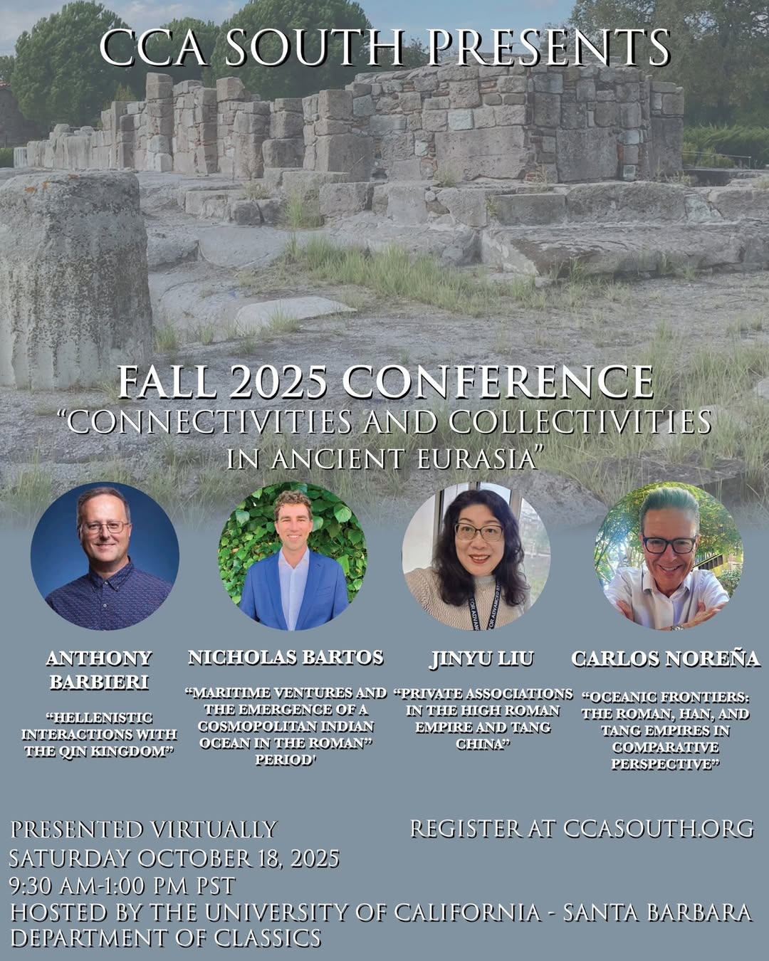The California Classical Association focuses on "the origin, the significance, and the reception of Roman, Greek, and related Ancient Mediterranean civilizations." And their Fall 2025 conference, on "Connectivities and Collectivities in Ancient Eurasia," is on October 18, 2025, 9:30 am-1:00 pm. It will be virtually broadcast, so join a great keynote lineup and listen in!