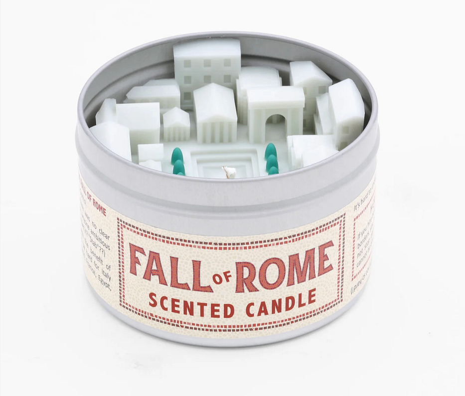 Just going to share the original product description because I can’t top it: Nothing lasts forever, and that includes the Roman Empire. The Fall of Rome-Scented Candle smells like cypress trees and red wine. Light it and watch the Roman forum melt into a puddle of wax while you quietly contemplate the impermanence of civilizations and/or candles..