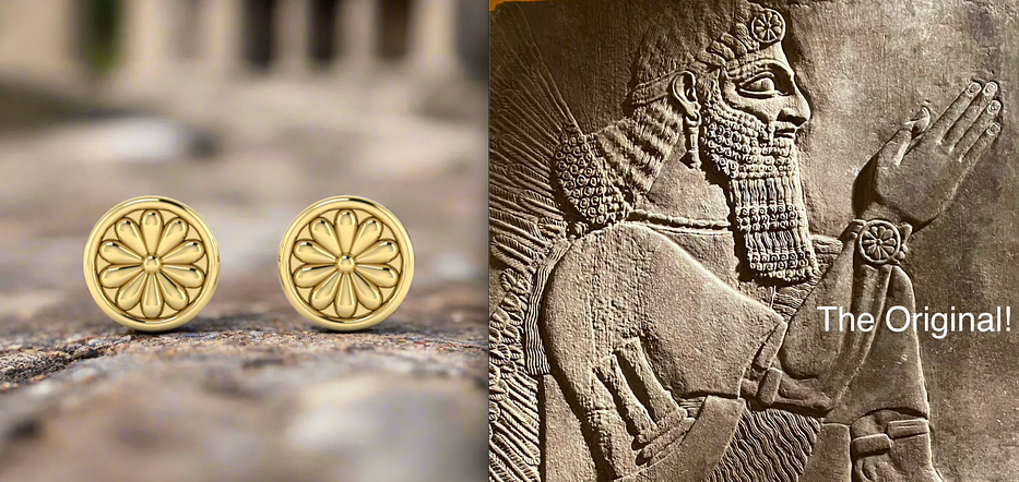 Based on the floral motif from the alabaster reliefs in Ashurnasirpal’s palace at Nimrud, 880 BCE. He wore it before it was cool.