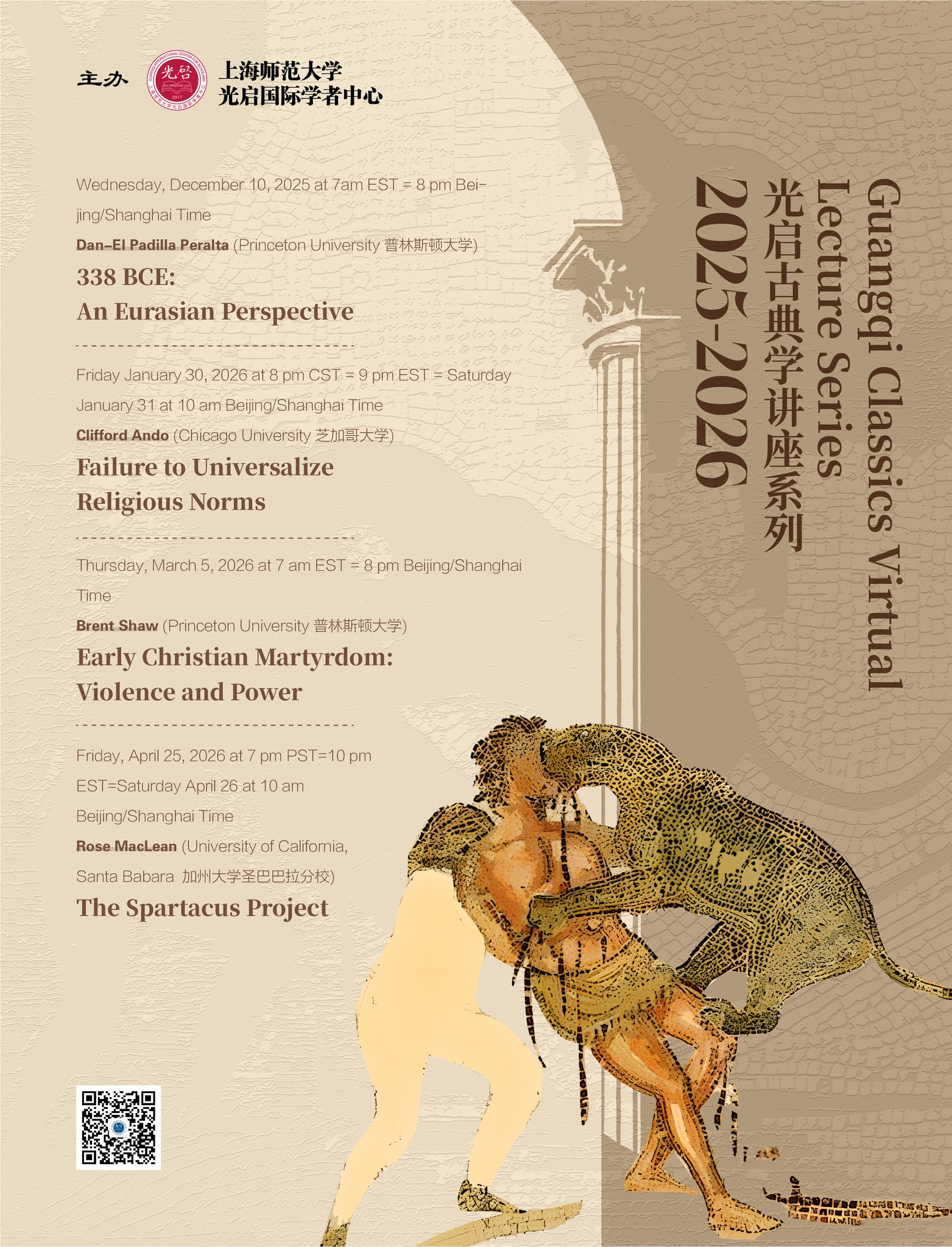 The Guangqi Classics Lecture Series is back. On Wednesday, December 10, 2025 at 7am EST = 8 pm Beijing/Shanghai Time you can tune in to the Zoom link to hear Dan-el Padilla Peralta discuss “338 BCE: An Eurasian Perspective 公元前338年:欧亚视角” The next lecture is then on Friday, January 30, 2026 at 8 pm CST = 9 pm EST = Saturday January 31 at 10 am Beijing/Shanghai Time 2026年1月30日星期五 美国中部时间晚上8点 = 美国东部时间晚上9点 = 北京时间1月31日星期六上午10点Clifford Ando (Chicago University 芝加哥大学), “Failure to Universalize Religious Norms 宗教规范普世化的失败". We will be updating the list of upcoming talks in the Spring.